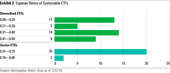 The expense ratios of sustainable exchange-traded funds have been falling. As recently as 2016, the only two diversified ESG ETFs cost 50 basis points, but today, nearly all of the now more than 40 such ETFs have lower expense ratios. In fact, 13 charge between 9 and 20 basis points. It’s hard to compete with market-cap-weighted index ETFs that have rock-bottom expense ratios, but these are certainly in the ballpark.