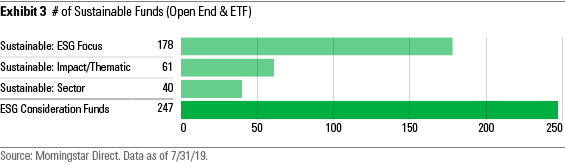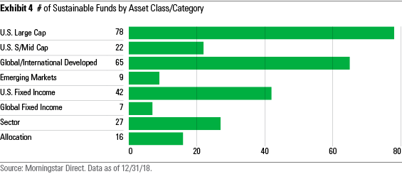 Investors can find sustainable funds in 65 Morningstar Categories, with plenty of viable choices in the mainstay categories for most portfolios: U.S. equity, non-U.S. equity, and investment-grade bond.