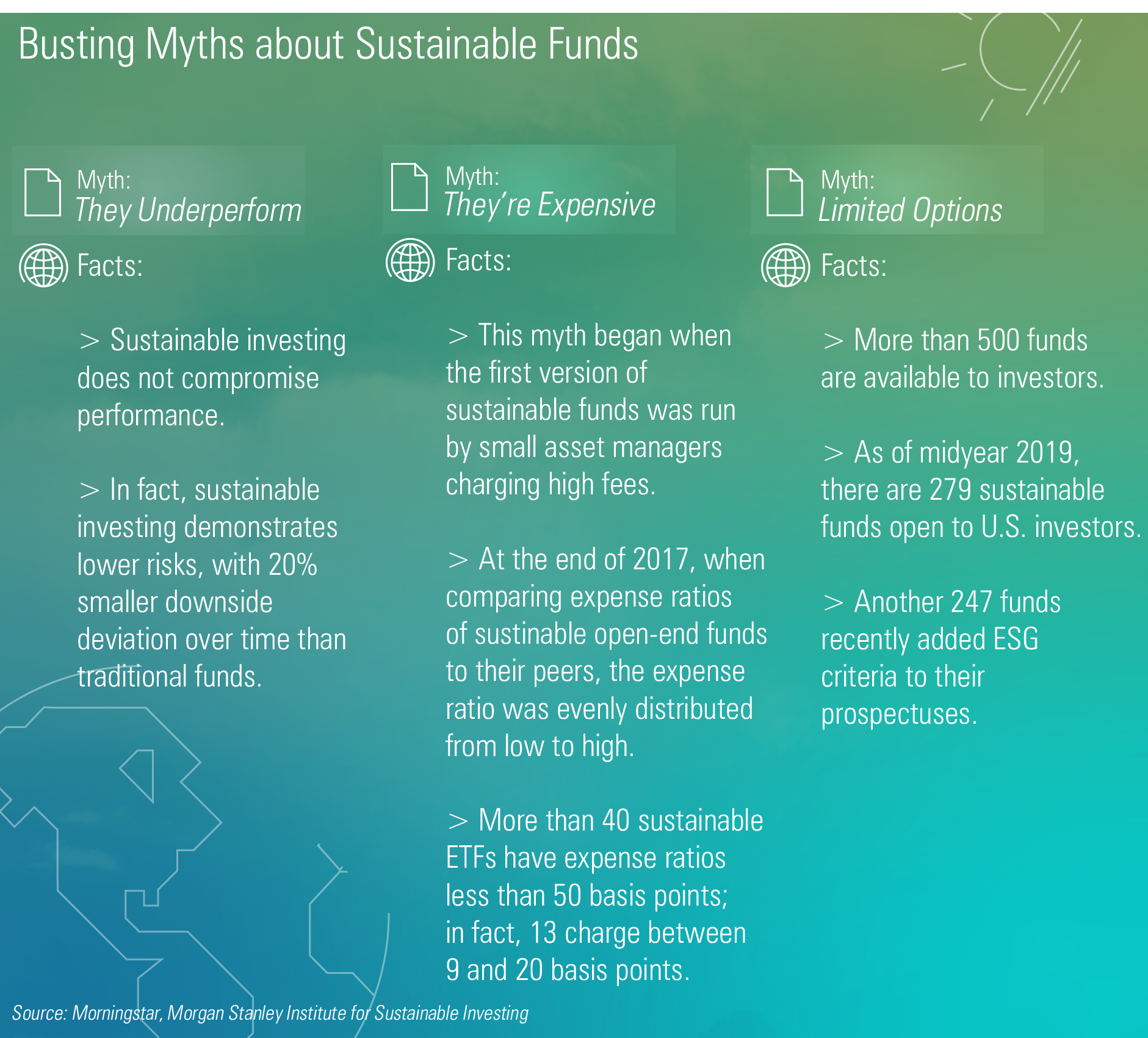 To summarize, sustainable funds, as a group, don’t underperform; they aren’t too expensive; and there are plenty of choices available to use in building sustainable fund portfolios. Understanding these claims as myths can go a long way toward helping those interested in sustainability embed it in their investments.