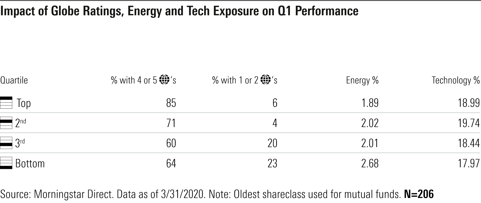 The better relative performance of sustainable funds in the first quarter derives mainly from their focus on companies that have stronger ESG profiles/lower ESG risk and, secondarily, from their tendency to be underweight energy.