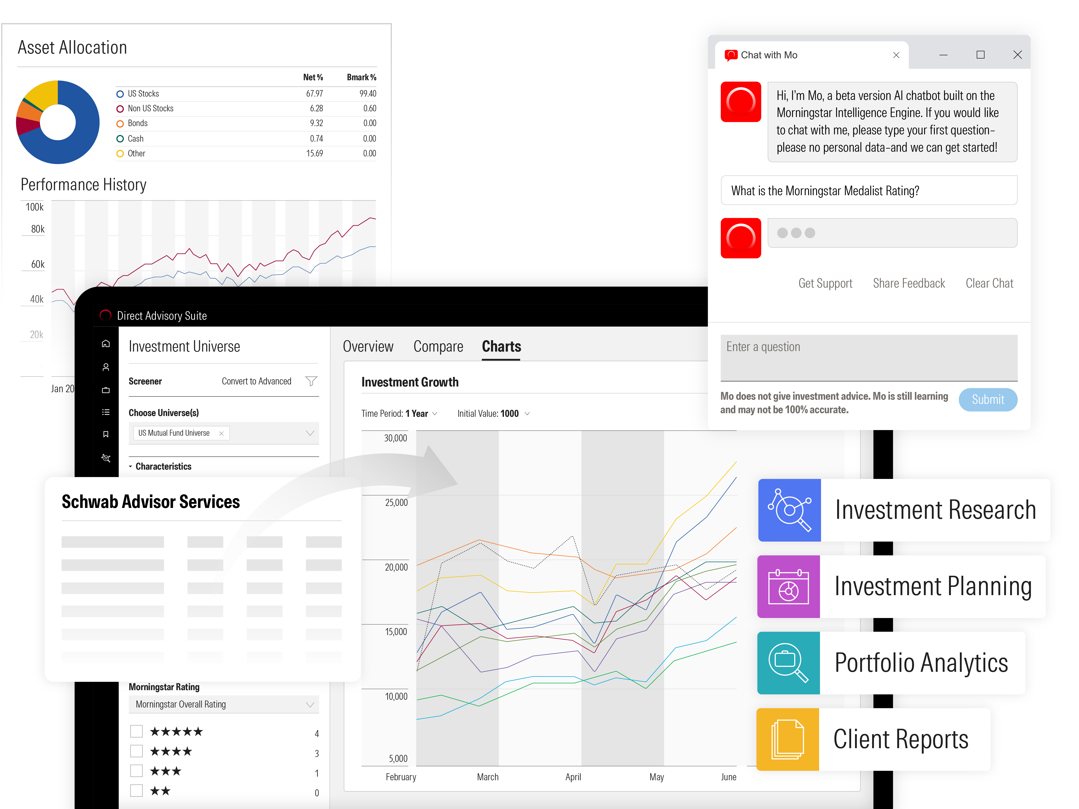 Advisors that custody with Charles Schwab have multiple integration options, including Intelligent Import, Data Sync, Morningstar ByAllAccounts, MoneyGuidePro, eMoney, and Redtail.